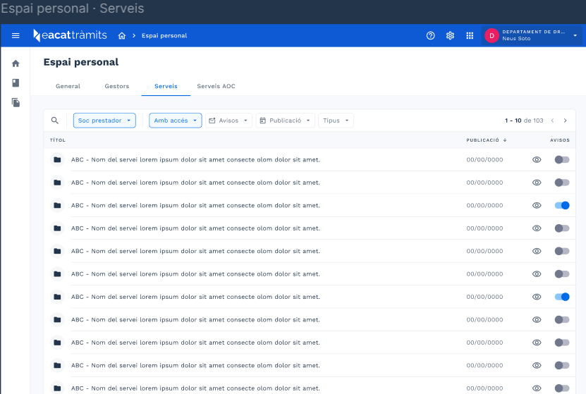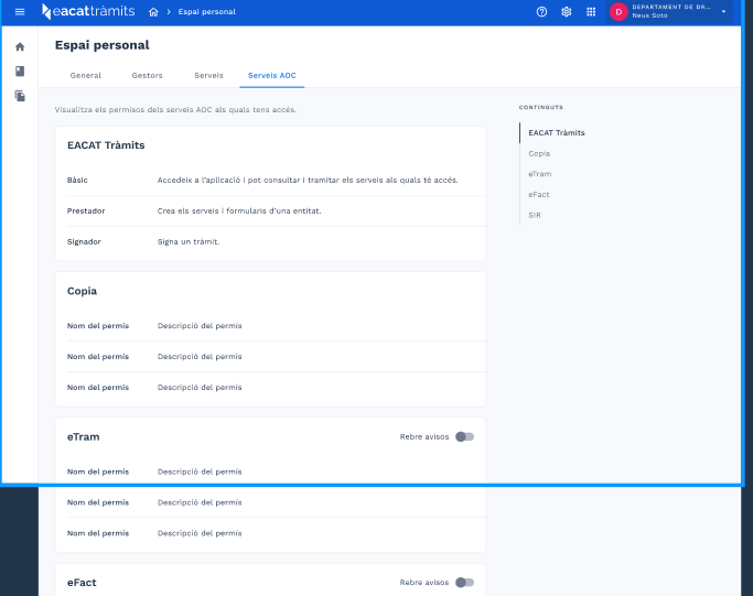 - A Serveis per a EACAT Tràmits, selecciona i activa els serveis de tramitació interadministrativa dels quals vols rebre avisos.