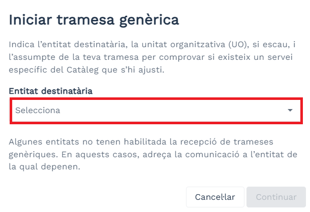 A la pantalla Iniciar tramesa genèrica, indica l’entitat destinatària.