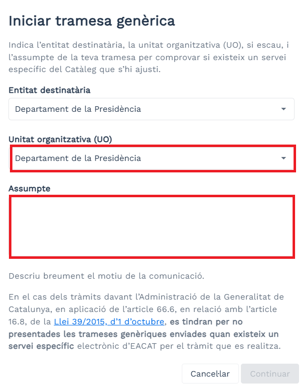 Selecciona l’ assumpte i, si escau, la unitat organitzativa.