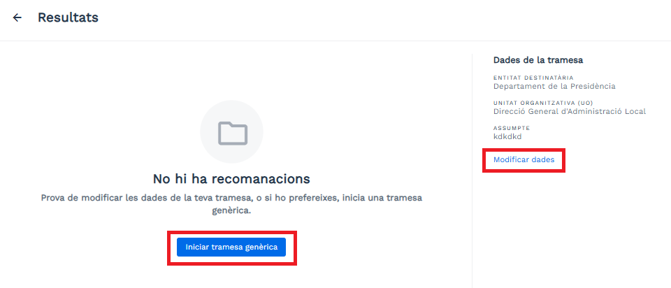 Si hi ha coincidències, el sistema et mostrarà recomanacions de serveis específics: