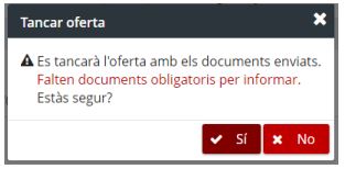 Es a dir, els licitadors poden tancar i posteriorment enviar l’oferta la presentació sense adjuntar tot els documents requerits. En aquest cas, l’eina els avisarà amb el literal de sota en el moment del tancament.