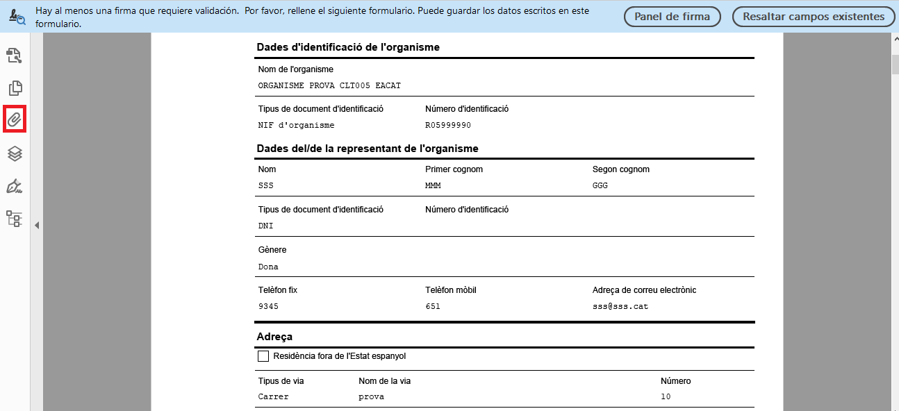 - Un cop en el formulari PDF, prem el clip d’arxius adjunts que facilita el propi Adobe Acrobat.