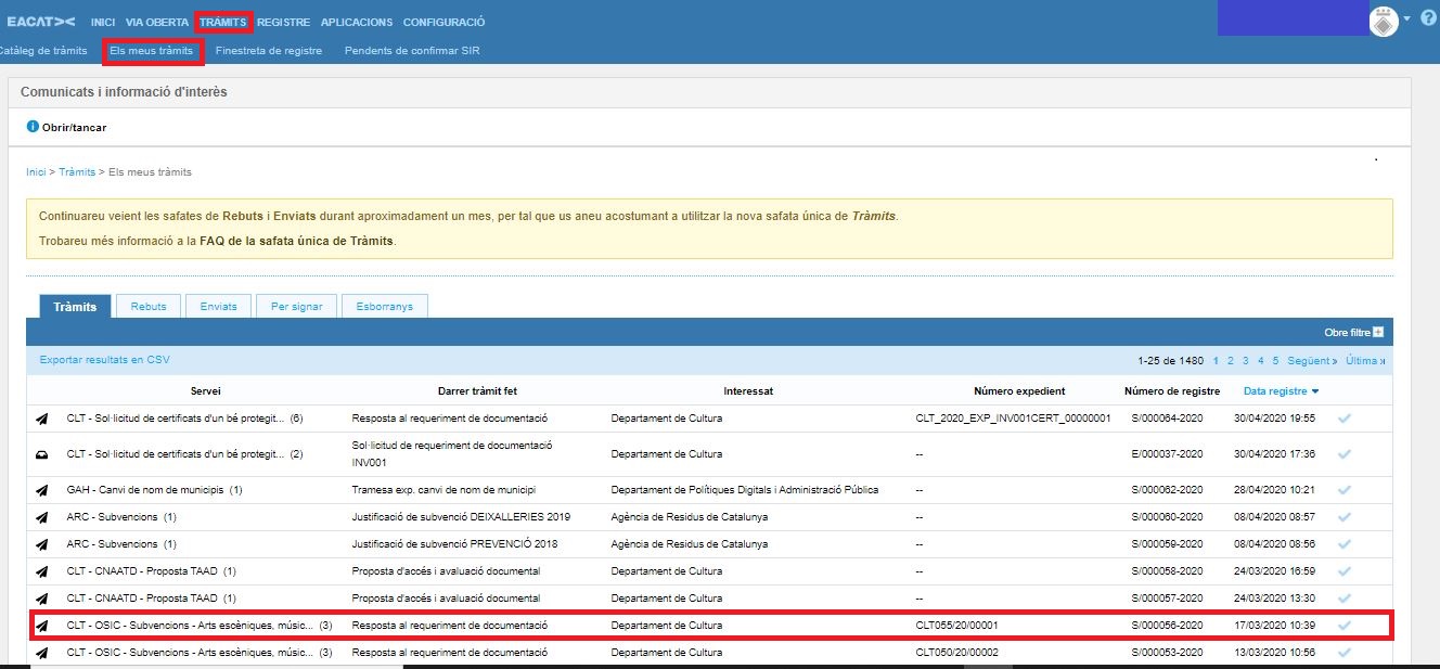 - Cerca el flux de tramitació, corresponent al tràmit, a la safata única de tràmits anomenada Els meus tràmits.