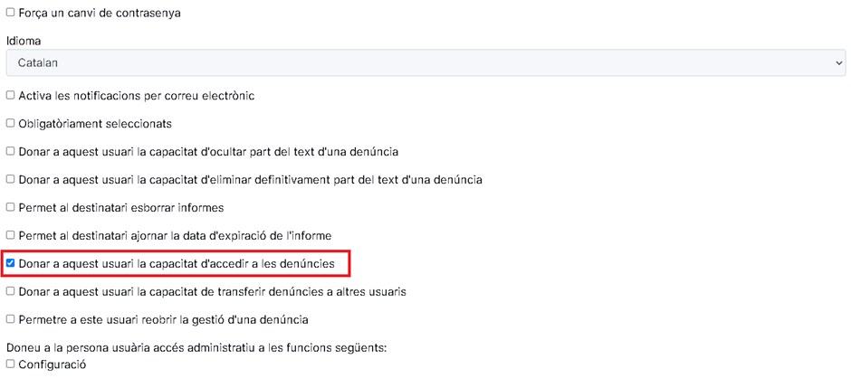 En la gestión de personas destinatarias encontramos una opción nombrada: Dar a este usuario la capacidad de acceder a las denuncias.