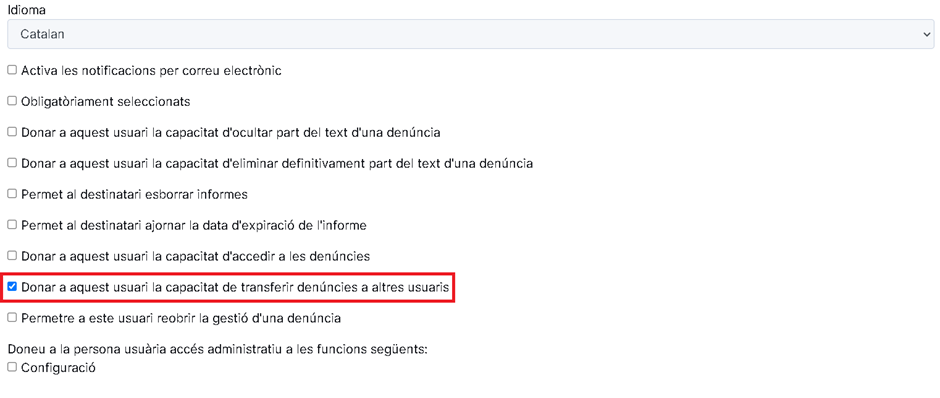 En la gestión de personas destinatarias encontramos también una opción llamada: Dar a este usuario la capacidad de transferir denuncias a otros usuarios